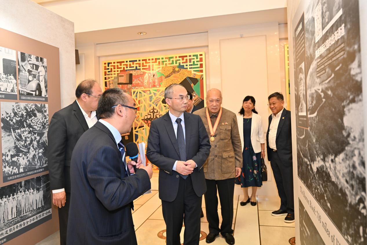 云南昆明市博物馆馆长陈浩围绕南侨机工的感人历史作了详细介绍,并引导曹忠明大使和嘉宾观看图片展。陈浩馆长介绍,这是一场艰苦卓绝的战争,也是一场得道多助的战争。在陈嘉庚先生的号召下,以东南亚华侨为主,印度裔、马来裔、缅甸裔、印尼裔等组成的3200多名专业技术机工,在亚洲被法西斯阴霾笼罩的危急时刻,毅然放弃海外的安逸生活,组成“南洋华侨机工来华服务团”,踏上滇缅公路,冒着硝烟,不惧牺牲为抗战抢运军需辎重,筑起了一道坚实的抗战生命线。从1939年到1942年滇缅公路被切断之前的三年间,南侨机工们共抢运了约45万吨军需物资,占当时国际援华物资总量的90%以上。他们运送的每一枪一弹、每一桶汽油、每一粒粮食,都源源不断地输送到前线,有力地支撑了正面战场的抗战,为保卫西南大后方、维持抗战经济生命立下了汗马功劳。他们的存在,不仅是一条物理上的运输线,更是一条精神上的纽带,彰显了伟大的国际主义精神;他们的壮举,是中国抗战史和世界反法西斯战争史上不可磨灭的光辉一页。