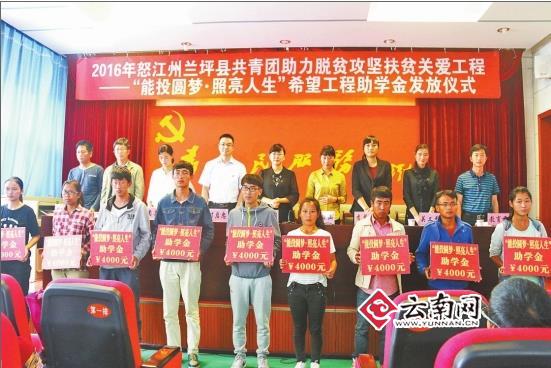 2016年,能投集团把脱贫攻坚写入“十三五”规划,提出了“教育扶智谋长远,精准帮扶斩穷根”的战略思想。共捐资540万元,在省内多个特困地区设立奖学助学基金,专项实施“能投圆梦·照亮人生”希望工程项目,资助贫困学子1134名。其中,怒江州150万元资助了泸水市100名、兰坪县125名、福贡县102名、贡山县48名品学兼优的贫困家庭大学生共375名,每人4000元;昭通市威信县150万元,奖励资助了375名贫困家庭大学生每人4000元;丽江市宁蒗县100万元,奖励资助了250名贫困家庭大学生每人4000元;保山市龙陵县40万元,奖励资助了100名贫困大学生每人4000元。此外,又另行捐资100万元,专项资助集团挂包帮扶的福贡县2016年全体34名考取本科的农村贫困家庭大学生。